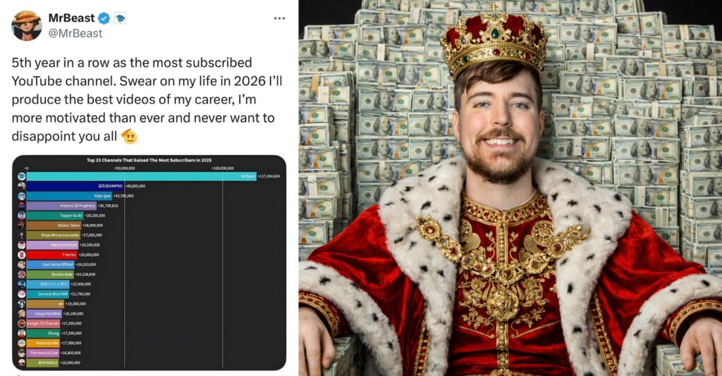 MrBeast lo vuelve a hacer. El creador de contenido más influyente del mundo mantiene su posición como el YouTuber número uno de Estados Unidos por quinto año consecutivo, reafirmando un dominio que parece no tener competencia en la plataforma. El reconocimiento llega en 2025, un año en el que su crecimiento, impacto cultural y alcance […]